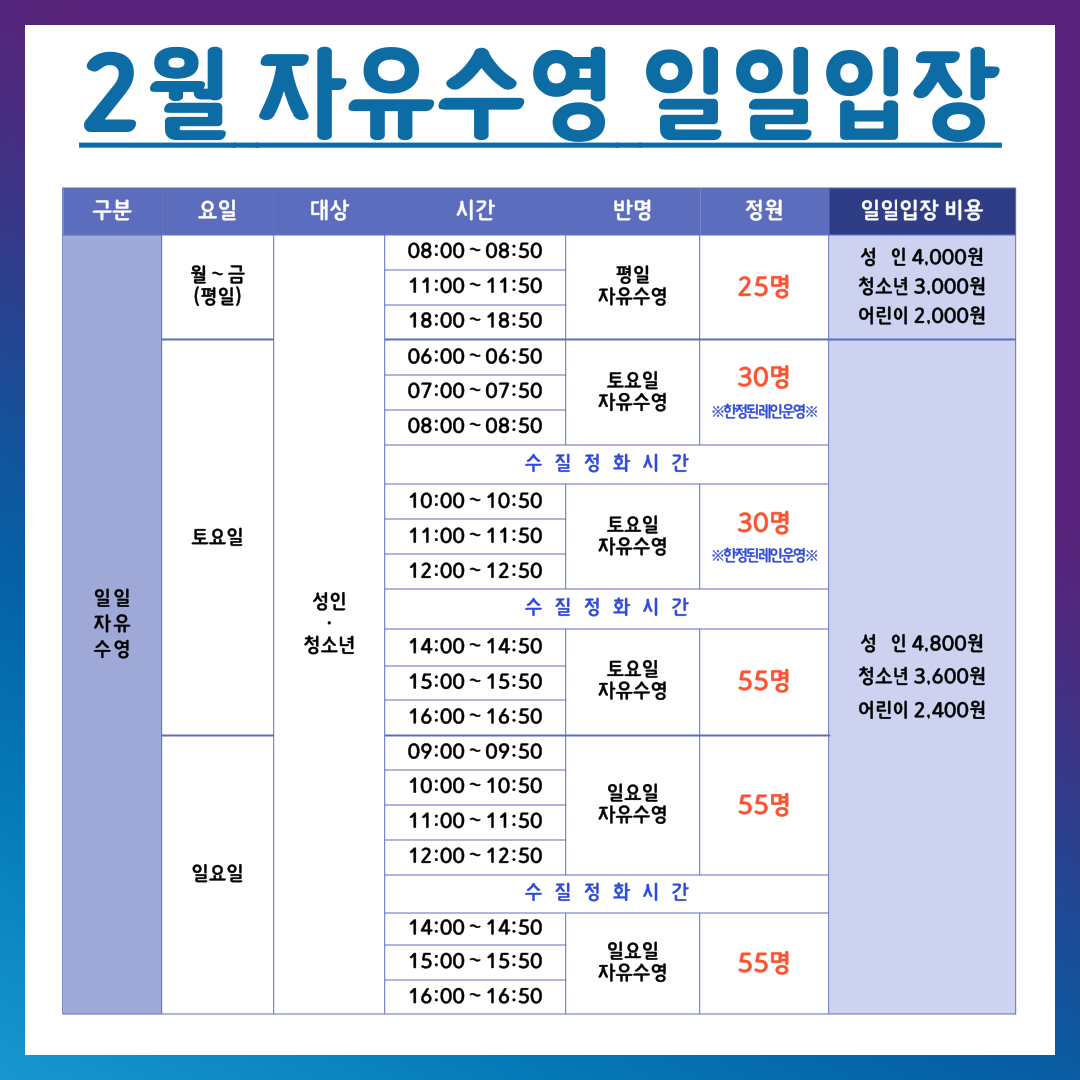 2월 자유수영 일일입장 안내