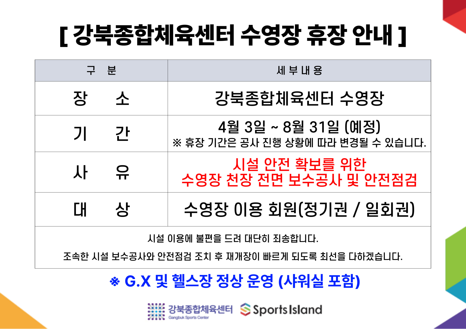 강북종합체육센터 수영장 휴장 안내